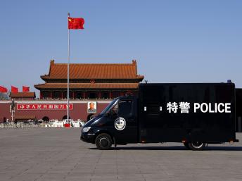 Xe cảnh sát trước Đại sảnh đường Nhân dân (Bắc Kinh), nơi diễn ra cuộc họp Quốc hội Trung Quốc. REUTERS/David Gray