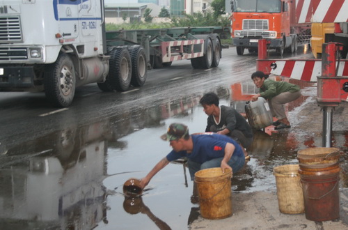 Container lật, dân đổ xô ra đường vớt dầu