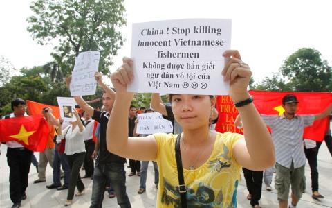 Nhiều người Việt biểu tình chống Trung Quốc trước đại sứ quán Trung Quốc ở Hà Nội, 12/6/2011. Hình: Reuters
