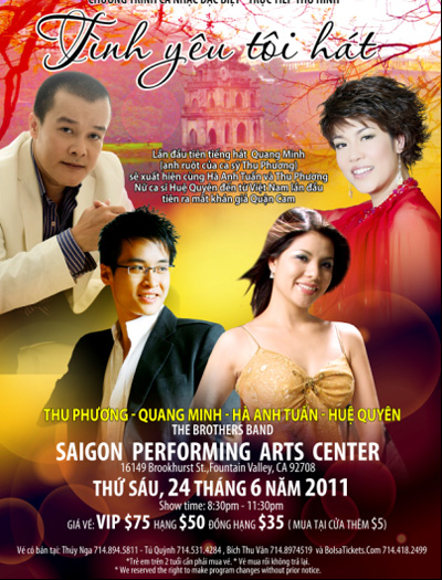 Tám giờ tối Thứ Sáu, 24 tháng 6, 2011, người yêu nhạc tại quận Cam sẽ có một chương tŕnh văn nghệ dành cho những người yêu thích âm nhạc bằng trái tim, được tŕnh diễn bởi những ca sĩ hát bằng trái tim: “T́nh Yêu Tôi Hát,” với Thu Phương, Hà Anh Tuấn, Quang Minh, và Huệ Quyên, tại Sài G̣n Performing Art Center, thành phố Fountain Valley.