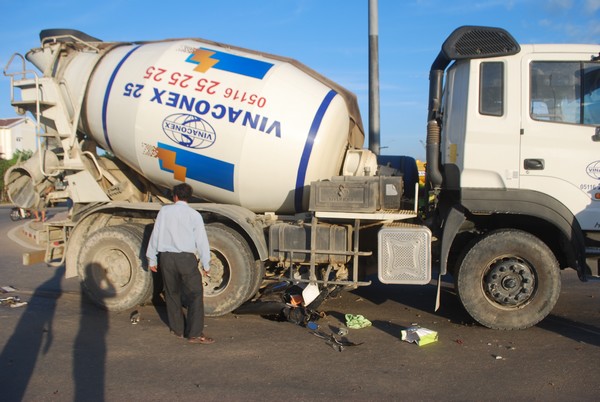 Xe bê tông cán nát xe máy, hai mẹ con thoát chết