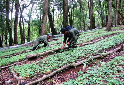 Công nhân đang chăm sóc sâm Ngọc Linh.