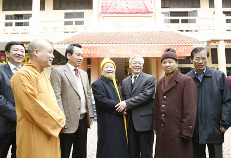 Ngày 17/2/2010 (mùng 4 Tết Canh Dần), Chủ tịch Quốc hội Nguyễn Phú Trọng thăm, chúc Tết Học viện Phật giáo Việt Nam tại thành phố Hà Nội. Trong ảnh: Hòa thượng Thích Thanh Tứ - Phó Chủ tịch Thường trực Hội đồng Trị sự Trung ương Giáo hội Phật giáo Việt Nam, Viện trưởng Học viện Phật giáo - đón Chủ tịch Quốc hội Nguyễn Phú Trọng.