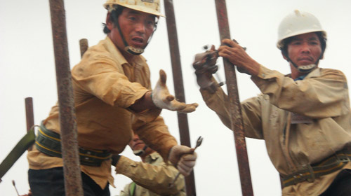A Trung (trái) - một công nhân Trung Quốc - với công việc khá đơn giản là ráp giàn giáo cùng với nhiều công nhân Việt Nam