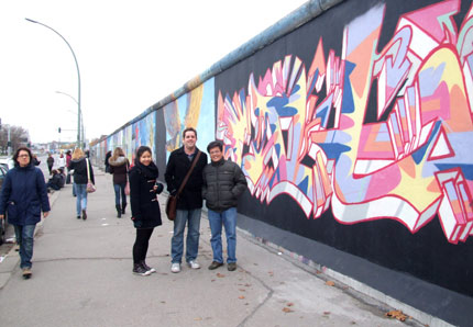 Tác giả (bên phải) chụp ảnh cùng khách du lịch bên bức tường Berlin.
