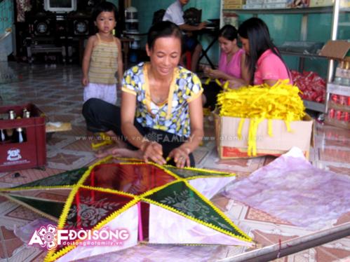 “Để làm được đèn ông sao, phải trải qua thời gian dài và nhiều công đoạn tỉ mỉ, đ̣i hỏi sự cần mẫn của người sản xuất. Suốt từ tháng Giêng, những hộ sản xuất phải lo đi mua nứa, mua đay và giấy bóng kính. Mỗi ngày đều chẻ nứa, buộc khung, phơi khung cho đến tận tháng 5 th́ bắt đầu làm đèn ông sao. Ṛng ră hơn bảy tháng trời, nếu thời tiết thuận hoà th́ được lăi vài ba triệu, c̣n không, coi như lỗ”. Vừa nói, bà Yến vừa nhanh tay dán miếng giấy bóng xanh đỏ vào khung.