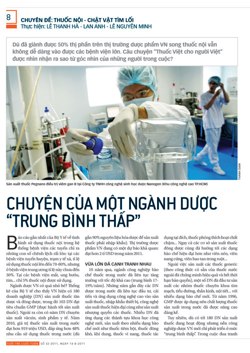 Nhưng trong t́nh h́nh hiện nay th́ thế nào? Ngoại trừ  một số thuốc đặc trị mà điều kiện sản xuất trong nước chưa cho phép sản  xuất, c̣n thuốc đang sản xuất (đa số nằm trong danh mục thuốc thiết yếu  hay thuốc generic) của các công ty, xí nghiệp dược phẩm ta mà chúng tôi  có dịp t́m hiểu th́ không thua kém so với thuốc ngoại tương đương.