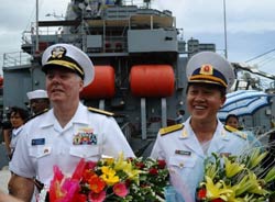 Đô đốc Mỹ Tom Carney (T) và Đại tá Hải quân Việt Nam Nguyễn Văn Lâm chụp tại cảng Tiên Sa, thành phố Đà Nẵng hôm15/7/2011. AFP photo