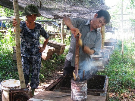 Vợ chồng ông Minh hàng ngày đến các tổ ong “di cư” từ trong Vũng Tàu của mình để lấy mật