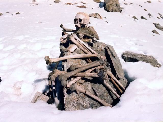 Mỗi năm một lần, khi ánh nắng mặt trời làm tan chảy lớp băng giá bao phủ trên mặt hồ Roopkund, thuộc đỉnh Himalaya, th́ hàng trăm bộ xương người lại hiện ra, ngổn ngang giữa ḷng hồ.