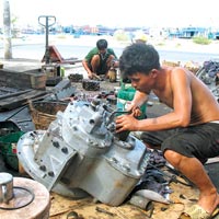 Thợ máy đang dọn máy để lắp lên tàu cá mới. Ảnh chụp tại Hòn Rớ, Nha Trang