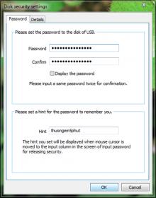 Tiếp theo, tại hộp thoại Disk security settings, bạn cần nhập mật khẩu vào 2 ô PasswordConfirm sao cho giống nhau. Bạn có thể nhấn Display the password để xem mật khẩu nhập vào có đúng chưa? Tiếp theo tại ô Hint, bạn nên nhập vào một gợi ư cho mật khẩu. Chuyển sang thẻ Details, tại đây bạn cũng có thể chọn thuật toán mă hóa dữ liệu AES 256 bit hoặc không mă hóa, tuy nhiên theo khuyến cáo từ nhà sản xuất th́ bạn nên để chế độ mă hóa mặc định để dữ liệu được an toàn hơn. Với các phiên bản thương mại khác th́ tại bước chọn thuật toán mă hóa bạn sẽ có nhiều lựa chọn hơn so với phiên bản cá nhân này. Tuy nhiên các phiên bản đó chỉ được sử dụng thử trong ṿng 15 ngày.