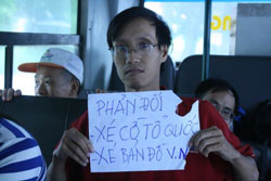 Anh Nguyễn Văn Dũng - lên xe bus vẫn tiếp tục biểu t́nh Nguồn: Mẹ Nấm.