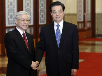 Chủ tịch Trung Quốc Hồ Cẩm Đào (P) và Tổng bí thư Đảng Cộng Sản Việt Nam Nguyễn Phú Trọng tại Đại Lễ Đường Nhân Dân Bắc Kinh, ngày 11/10/2011.