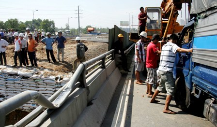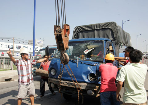 TP. HCM: Cần cẩu đổ rạp vào xe ô tô đang chạy trên đường