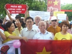 Nhà sử học Dương Trung Quốc chụp chung với người biểu t́nh trước cửa Nhà hát lớn.
