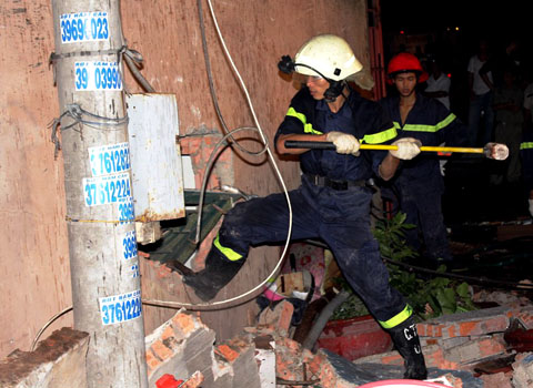 Một cảnh phá tường chui vào trong căn nhà sập đổ tìm nạn nhân của cảnh sát cứu hộ TP HCM. Ảnh: An Nhơn.