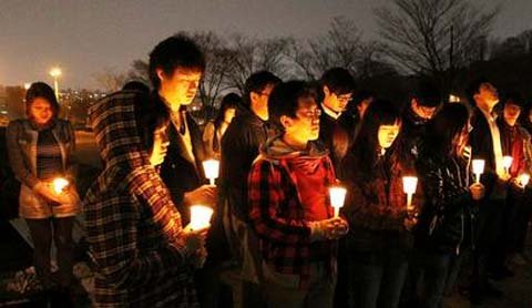Sinh viên Học viện Công nghệ và Khoa học tiên tiến Hàn Quốc thắp nến tưởng nhớ bạn của họ tự tử ở Daejeon ngày 10/4/2011. Sau khi tới gặp bác sĩ tâm lư, một sinh viên toán 19 tuổi của trường đă nhảy lầu tự vẫn v́ bị điểm thấp. (Ảnh: AP).