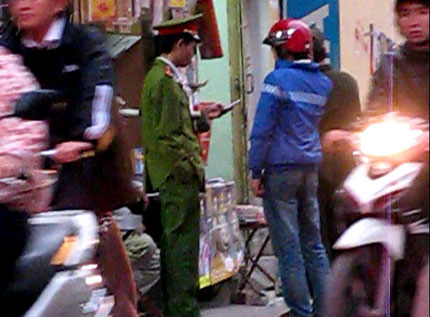 Công an phường tay đút túi, tay cầm điện thoại trong khi vẫn đang làm việc với người vi phạm. Ảnh chụp chiều 23/11 tại đầu đường Khương Đình.