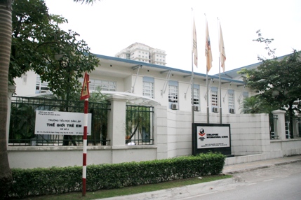| Theo các bậc phụ huynh tấm  biển trường Tiểu học  Dân lập Thế giới Trẻ em mới được gắn lên bên cạnh  tấm biến trường Quốc  tế Singapore khiến các phụ huynh vẫn lầm tưởng  con họ đang học chương  trình quốc tế (Ảnh: Phạm Thịnh)