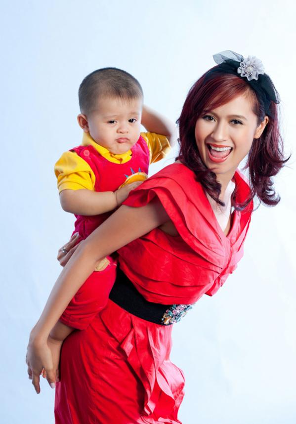 Ngoài trang phục chính, nữ ca sĩ còn tạo điểm nhấn cho con bằng kiểu tóc bới cao và cho mỗi bé cài một chiếc lông đà điểu trên đầu cho lạ mắt. Chị cũng cất công đi nước ngoài chọn mua chất liệu vải tơ tằm đặc biệt để may cho hai con những bộ cánh "có một không hai" ở Việt Nam.