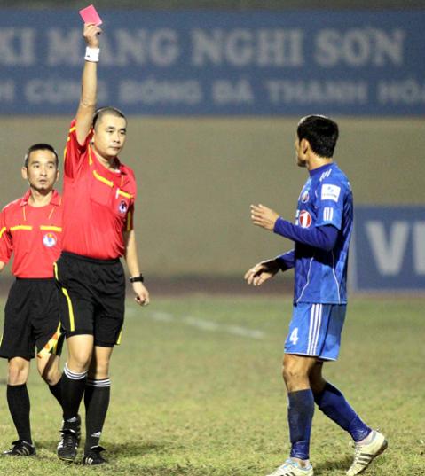 Trọng tài Nguyễn Trọng Thư và chiếc thẻ đỏ dành cho Chí Công (Ảnh: VSI)
