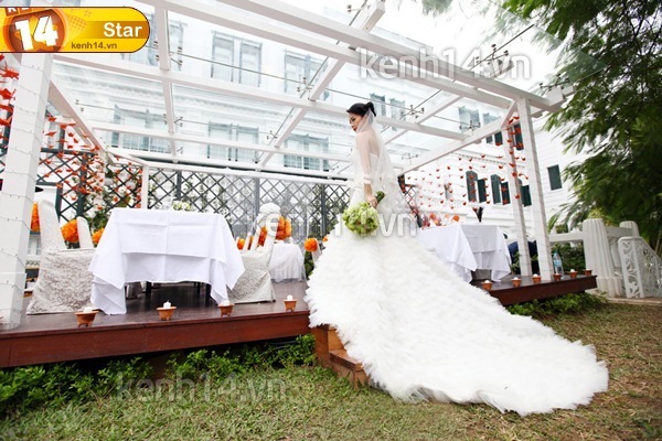 Trong "đám cưới giấy" này, Linh Nga đã diện một bộ lễ phục thật lộng lẫy khiến chị í trở nên vô cùng quyến rũ và xinh đẹp.
