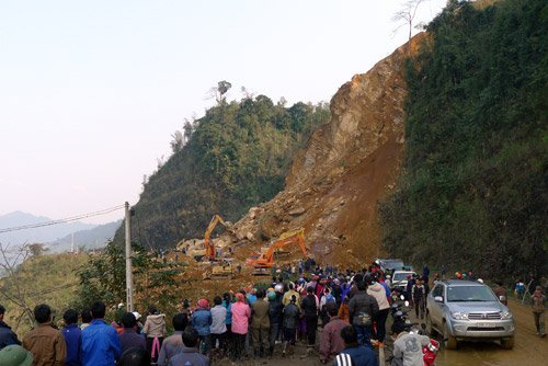 Lực lượng cứu hộ phải t́m cách tiếp cận hiện trường bằng cách từ trên cao xuống để ḍ ḿn phá nổ cho khối lượng đất đá dăn ra.