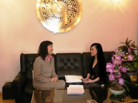 Bà Lưu Lan Phương Trưởng pḥng Lănh sự (trái) cùng phóng viên Nguyệt Nhi. Ảnh XX.