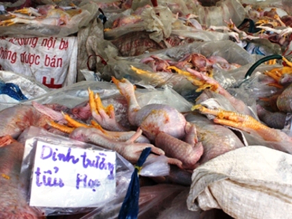 Tổ liên ngành phòng chống dịch gia súc, gia cầm tại Trạm kiểm dịch động vật Thủ Đức mở thùng xe thì mùi hôi thối bốc ra nồng nặc từ hàng trăm bọc chứa hàng ngàn con gà làm sẵn thịt da tím tái, ruồi nhặng bám đen…với số lượng gà nặng 2906 kg.