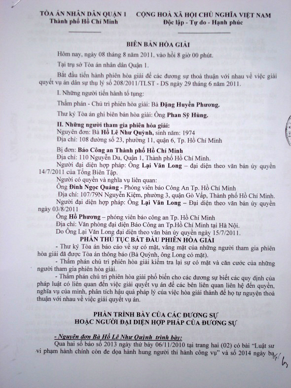 Ngày 01/08/2011, TAND Q1 tống đạt giấy triệu tập: lúc 08giờ ngày 02/08/2011 có mặt tại Tòa để hòa giải. Tại buổi hòa giải đại diện của báo CA TPHCM chưa thực hiện đủ thủ tục ủy quyền.