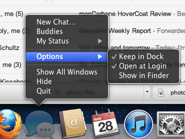 Nếu ứng dụng mà bạn dự định cho chạy tự động đang nằm trên thanh dock của Mac OS X, hãy nhấn chuột phải lên biểu tượng của ứng dụng đó (hay giữ phím Control và nhấn lên biểu tượng). Chọn Options và sau đó chọn Open at Login.