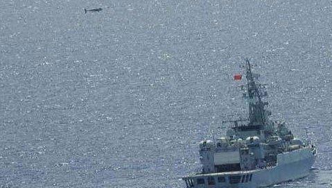 H́nh ảnh máy bay tuần tra của Nhật chụp được cho thấy một UAV nhỏ của Trung Quốc bay phía trên tàu của PLAN trong cuộc tập trận hải quân. Ảnh: SIGNAL Magazine