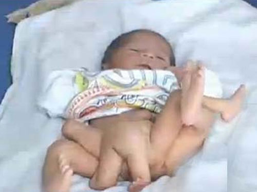 (NLĐO) - Một bé trai có 6 chân vừa chào đời ở Sukkur (Pakistan) các đây vài ngày. Đây là trường hợp mắc bệnh di truyền hiếm gặp, với tỉ lệ 1/1.000.000 trẻ em.