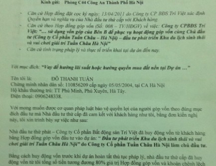 Sau hơn 12 tháng chờ đợi Công ty cổ phần bất động sản Trí Việt thực hiện các điều khoản theo hợp đồng không có kết quả. Cực chẳng đă, ông Đỗ Thanh Tuấn đă phải tiến hành làm thủ tục khởi kiện đơn vị này ra ṭa án. Theo đơn kiến nghị của ông Đỗ Thanh Tuấn, trú tại thị trấn Phú Minh, huyện Phú Xuyên, Hà Nội: Năm 2010, ông Đỗ Thanh Tuấn kư hợp đồng góp vốn số 008 – TV/HĐGV với Công ty cổ phần bất động sản Trí Việt (trụ sở tại số 142 Đội Cấn, Hà Nội) để được Công ty này cam kết dành cho ông Tuấn quyền mua 120m2 đất nền dự án Ecopark Tuần Châu Hà Nội.