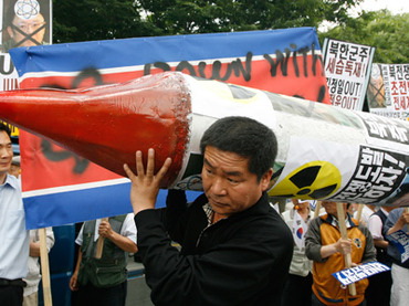 Một người Hàn Quốc tham gia tuần hành phản đối chương tŕnh tên lửa của CHDCND Triều Tiên - Ảnh:Reuters