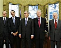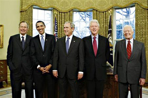 | | Bức ảnh chụp 5 đời Tổng thống Mỹ tại buổi họp mặt đặc biệt ở Phòng Bầu dục ngày 7/1/2009. Từ trái sang: Bush-cha, Obama, Bush-con, Clinton, Carter. Ảnh: Time |