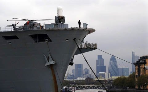 Tàu tấn công đổ bộ HMS Ocean hôm qua đi vào sông Thames, để tham gia hoạt động diễn tập chuẩn bị cho việc bảo vệ an ninh của Thế vận hội mùa hè.
