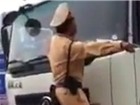 Cảnh sát giao thông đánh đu trên cần gạt nước xe tải.