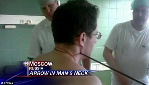 Trong một lần đi dạo cùng gia đình ở công viên, anh Konstantine Myakush sống tại Moscow, Nga đã bất ngờ bị… mũi tên đi lạc đâm xuyên cổ. Mặc dù bị thương nặng nhưng người đàn ông 38 tuổi này vẫn may mắn sống sót.