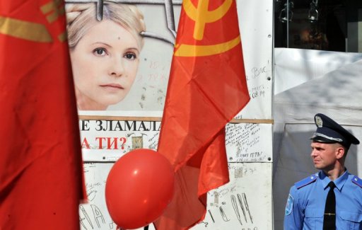 Một cảnh sát đang đứng trước chân dung của nhà đối lập Ukraina Yulia Tymoshenko hôm 1/5. Ảnh: AFP