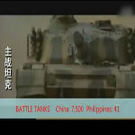 Các báo Trung Quốc đã cắt những hình ảnh so sánh lực lượng 2 bên từ clip chiếu trên nhiều mạng quân sự của nước này. Đầu tiên là so sánh về lực lượng xe tăng chủ lực: Trung Quốc có khoảng: 7.500 xe các loại và Philippines là: 41