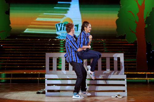 Ngay từ đêm đầu tiên, Vân Trang đă gây ấn tượng cho người xem khi cùng Huỳnh Đông vừa hát vừa múa ca khúc