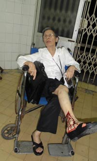 Bà Lê Hiền Đức: Đến 11 giờ đêm thì tôi vừa đói vừa mệt, trời lại tối, không còn cách nào để liên lạc với các cán bộ nữa. Sau 11 giờ đêm thì tôi thấy đau nhói và máu ở chân chảy ra rất nhiều. Đến gần 3 giờ sáng thì họ khiêng tôi đang ngồi trên ghế vào thang máy để đưa lên xe đi bệnh viện. Hơn 3 giờ sáng thì đến được bệnh viện nhưng không ai bàn giao tôi với bệnh viện cả. Tôi nghĩ sau này, khi bình phục lại thì tôi cũng sẽ nghiên cứu xem làm thế nào để có thể có ý kiến về việc này.
