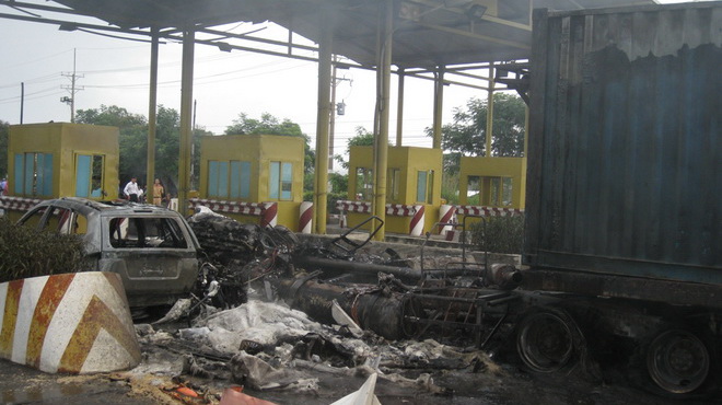 Tại hiện trường, xe container và xe 4 chỗ bị thiêu rụi hoàn toàn, mái che của trạm thu phí cũng bị khói lửa làm cháy sém nhiều chỗ. Toàn bộ lô hàng cục cao su trên thùng container bị hư hỏng.