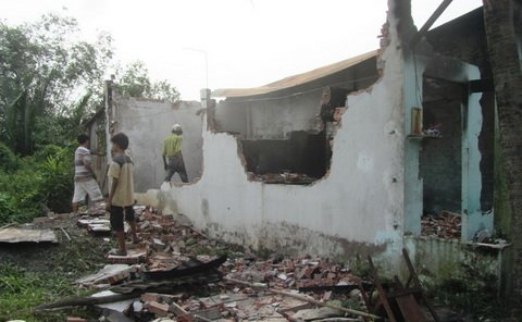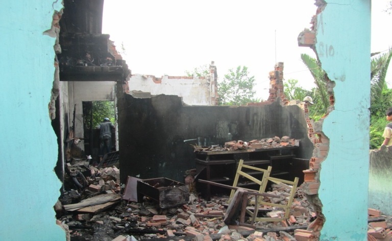 Theo địa chỉ trên, chúng tôi đă t́m đến hiện trường. Căn nhà cấp 4 bị cháy có diện tích khoảng 40m2 chỉ c̣n lại một đống đổ nát. Mái tôn và nhiều mảng tường bị sập. Bên trong nhiều vật dụng bị cháy đen, bị lấp dưới đống gạch vụn.