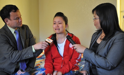 Cô Nguyễn Thị Như Huỳnh trả lời phỏng vấn phóng viên Ngọc Lan (phải) của nhật báo Người Việt và phóng viên Phạm Khanh của đài truyền h́nh Little Saigon TV, ngay khi vừa đặt chân đến Hoa Kỳ, hôm Thứ Năm. (H́nh: Dân Huỳnh/Người Việt)