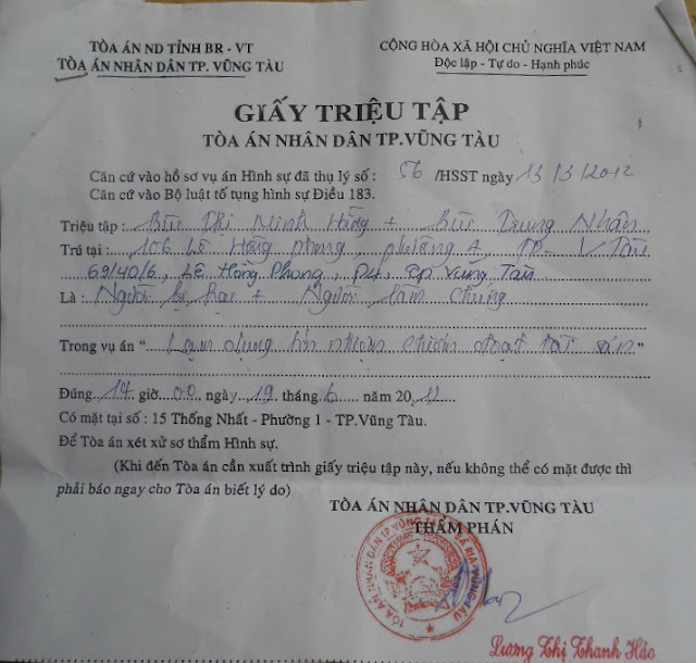 Thứ nhất: Về phía tòa án nhân dân TP Vũng Tàu Tôi khiếu nại về việc đưa giấy báo xử cho tôi vào ngày 15/6/2012, tức thứ sáu. Việc chậm trễ này khiến tôi khó khăn trong việc tìm kiếm luật sư, vì thứ bảy, chủ nhật là ngày nghỉ. Đến thứ ba ngày 19/6/2012 đã xét xử. Vậy trong 1 ngày thứ hai 18/6/2012 để tìm luật sư, ký hợp đồng, làm thủ tục bào chữa tại tòa là điều quá khó khăn. Trong khi những người liên quan đến vụ án này đã được đưa trước đó. Người của tòa án nại lý do rằng đến nhà không gặp tôi, hỏi công an địa phương thì công an bảo không biết. Vậy thì chính quyền địa phương quản lý nắm vững người thế nào, khi mà họ cần gặp tôi để mời đi họp tổ dân phố, đăng ký tạm trú đều gặp được tại nhà tôi. Vậy tôi xin hỏi rằng việc làm này của Tòa án nhân dân TP Vũng Tàu có phải là chủ ý gây khó khăn đối với tôi (người bị hại) về thời gian, tâm lý chuẩn bị hay là do cơ chế, pháp luật của đất nước này theo quy định là được phép đưa giấy triệu tập đến tòa tùy ý cho người liên quan. Nếu vậy thì pháp luật của nhà nước Việt Nam này tạo thuận lợi cho người dân hay gây khó khăn cho người dân?