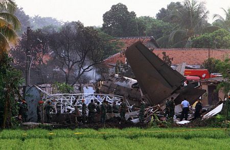 Chiếc máy bay Fokker 27 của quân đội Indonesia đă đâm xuống khu dân cư Rajawali gần sân bay quân sự Halim Perdanakusuma ở phía đông thủ đô Jakarta lúc 14h45 giờ địa phương.