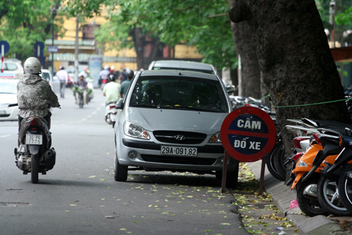 Biển cấm đỗ ô tô trên phố Trần Hưng Đạo không có tác dụng.